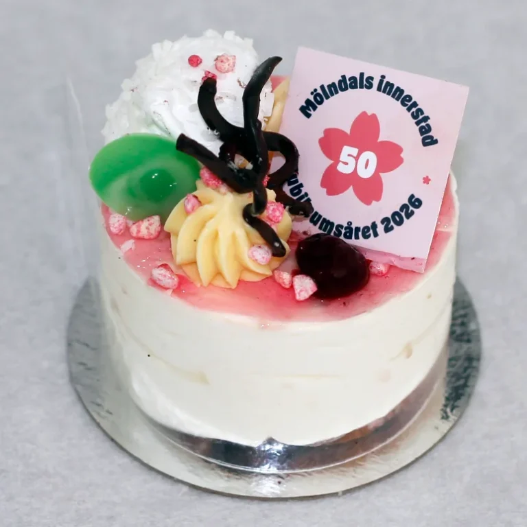 Mandelbotten, körsbärsfyllning, kokosmarshmallow och citronmousse spelar huvudrollerna i denna tjusiga skapelse från Steinbrenner & Nyberg som tagits fram särskilt för årets jubileum. Jubileumsbakelsen finns att köpa på Alfagatan och Ulla Jacobssons plats onsdag till söndag under perioden 15 april–30 september.
